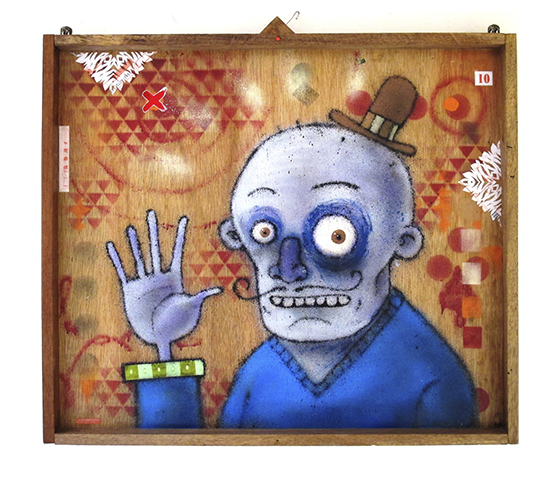 “Seu Funério” – pintura sobre madeira, spray, acrílica e colagem – medindo 72x80cm.